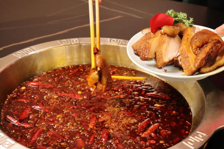 肘子火锅有两大亮点:第一是经过手工熬制的锅底,不加任何添加剂;第二是精选的肘子炸出酥皮,蒸透胶质,入锅煮到耙糯。从红汤中翻滚而出的肘子,经过精湛厨艺的加持,在麻辣中透出醇厚,油脂化在舌尖,却油而不腻,为食客带来“入口即化、肉香透骨”的独特体验。